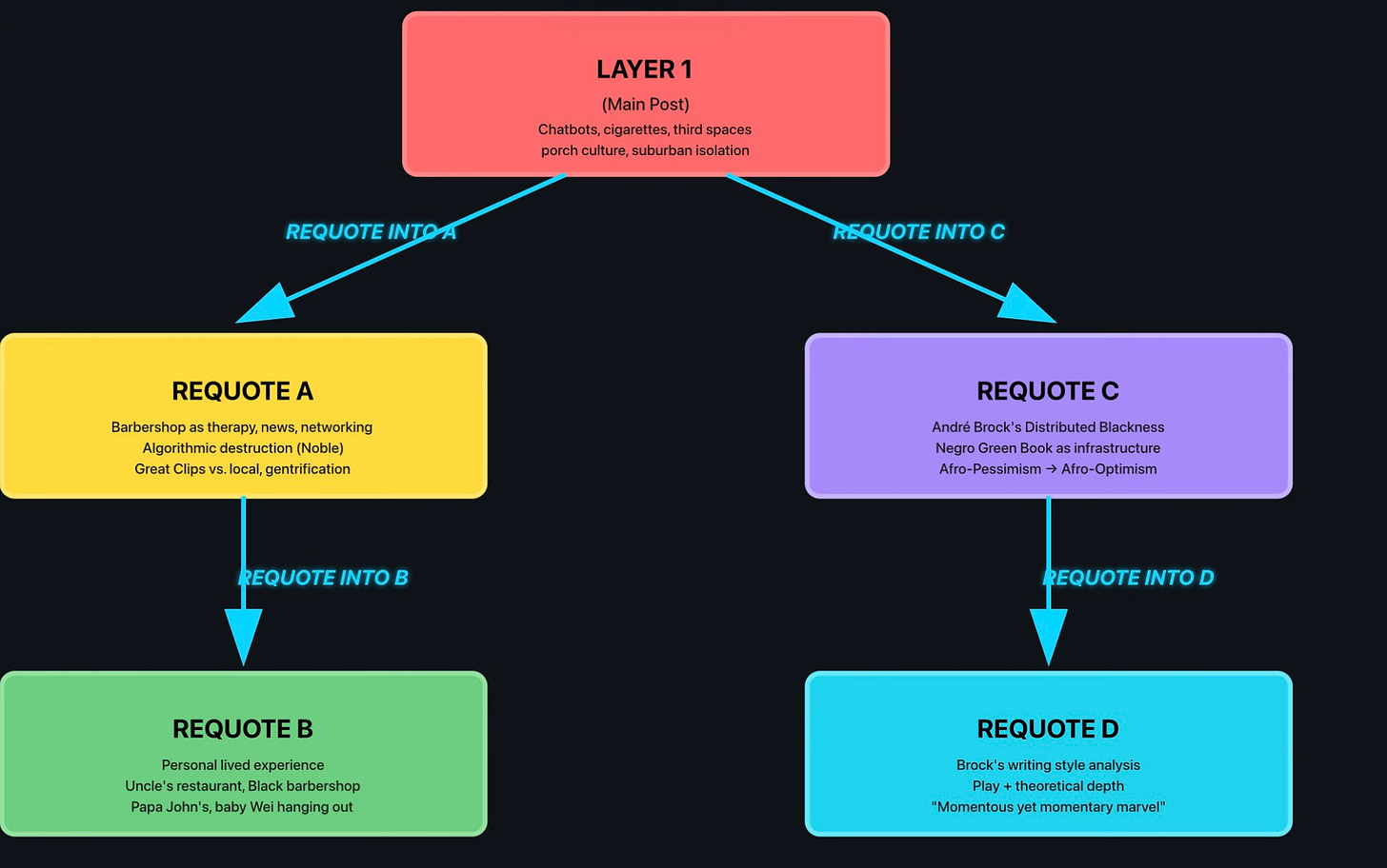 There was laughter, there was joy, there was TwitterAfterDark, all these became the perfect example where a digital third space that was both distributed AND relational, connected by the singular act, of being Black, and the recursive nature of subject formation of Blackness in the digital space. It was simultaneously "a megaphone for people who are on the margins" and a space where Black people could simply be themselves while creating anti Police resistance and Mac and Cheese recipes.